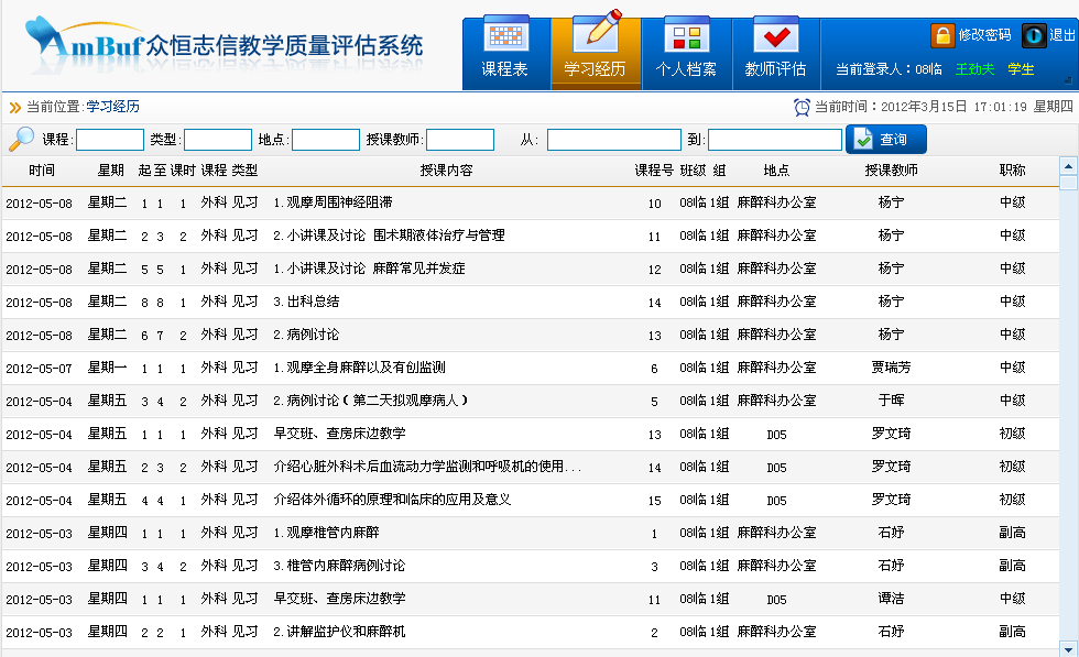 授课/学习经历功能可提供学生查看自己的学习经历,教师掌握自己所有教学信息,以便于申报、评职称等用途。