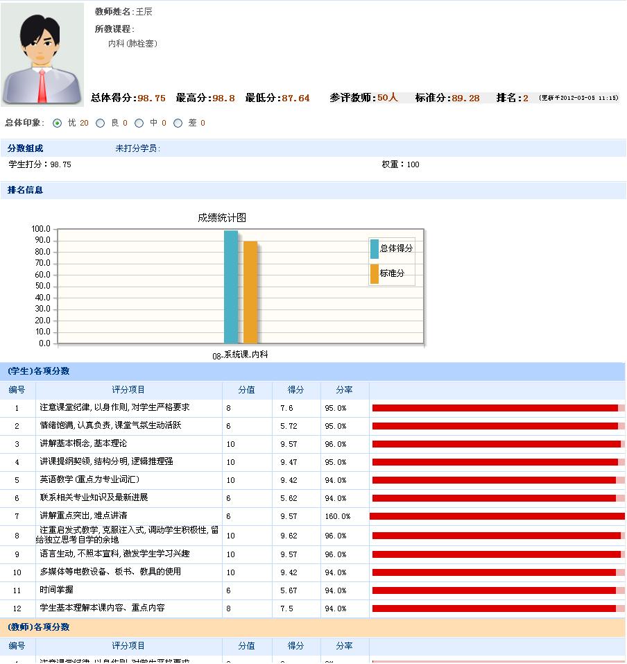 统计和档案功能记录个人的基本情况,教师登陆后显示评估统计,在评估结束后,在管理者授权的情况下可查看本人的综合评价信息,及课时费登记详情。管理者可以查看所有教师的评估详细结果。