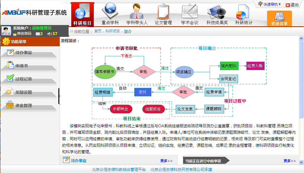 科研项目管理:实现从科研项目申请、立项论证、组织实施、经费记录、课题总结、成果记录的全程管理。