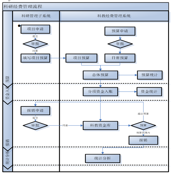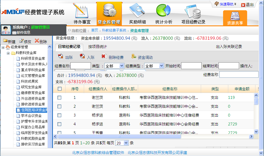 资金库管理:显示每个资金库的当前状态,可对每一个项目资金库进行出账和入账管理,报销单的上报、审批管理,且可查看经费操作的明细。